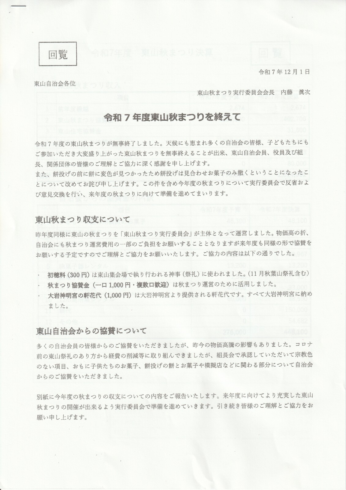 令和7年度 東山秋まつり予算 東山秋まつりお菓子配布対象者確認のお願い 大岩神明宮例大祭のご案内並びに大祭初穂料についてのお願い 大岩神明宮:例大祭 豊栄祭:参… -