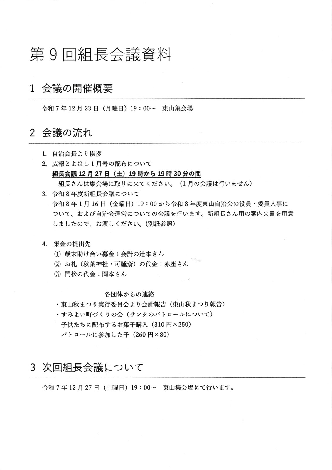 1・会議開催概要 日時 令和7年6月1日(日曜日) 19時~ 場所 東山集会場 2・会議の流れ 1 自治会長より挨拶 2 自治会長からの連絡 3 各団体からの報告 3・次回組長会議について 令和7年7月1日(火曜日)19時~東山集会場にて行います。 -
