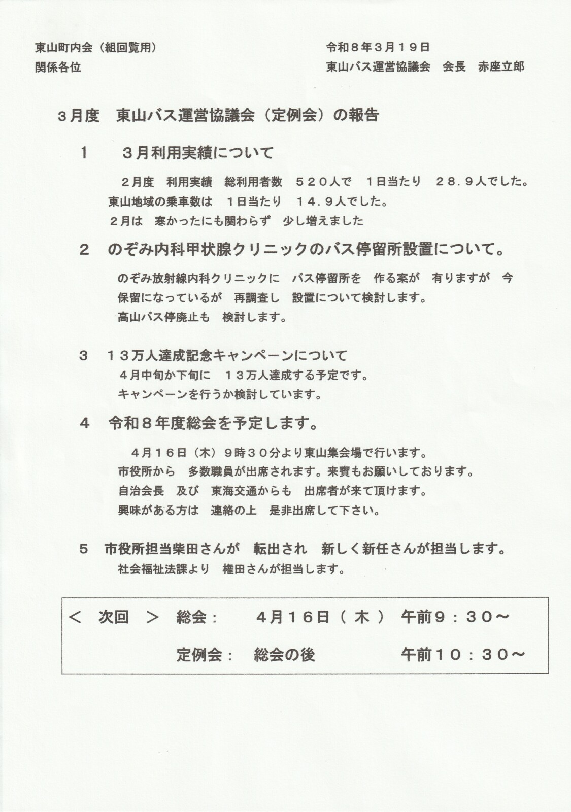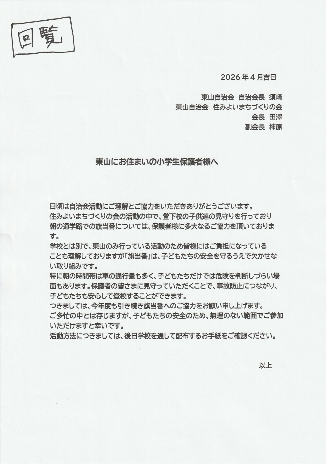 2026年(令和8年)4月回覧板 2026 4/05 回覧板 2026年4月5日 目次令和8年度東山自治会長からのごあいさつ 東山自治会ホームページのご案内 アリン子広場 タートル通信 東山にお住まいの小学生保護者様へ 3月度 東山バス運営協議会(定例会)の報告 犬の飼い主みなさんへ 飯村分館だより 詐欺対策byNTTタウンページ みんなの豊橋 防犯あいち 森の家シルバーの会 広報とよはし 令和8年4月号 広報とよはし 令和8年4月号 回覧板 よかったらシェアしてね! URLをコピーしました! URLをコピーしました! 2026年(令和8年)3月回覧板 第1回組長会議資料 関連記事 2026年(令和8年)3月回覧板 2026年3月5日 2026年(令和8年) 2月回覧板 2026年2月3日 2026年(令和8年)1月回覧板」 2026年1月6日 2025年(令和7年)12月回覧板 2025年12月6日 2025年(令和7年)11月回覧板 2025年11月6日 2025年(令和7年) 10月回覧板 2025年10月3日 2025年(令和7年)9月回覧板 2025年9月3日 2025年 (令和7年) 8月回覧板 2025年8月2日